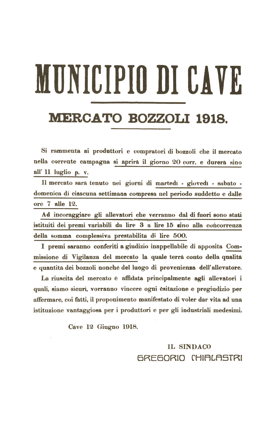 In alcuni documenti dell’archivio storico comunale sono riportati i dati della “industria” del baco da seta nel Comune di Cave.